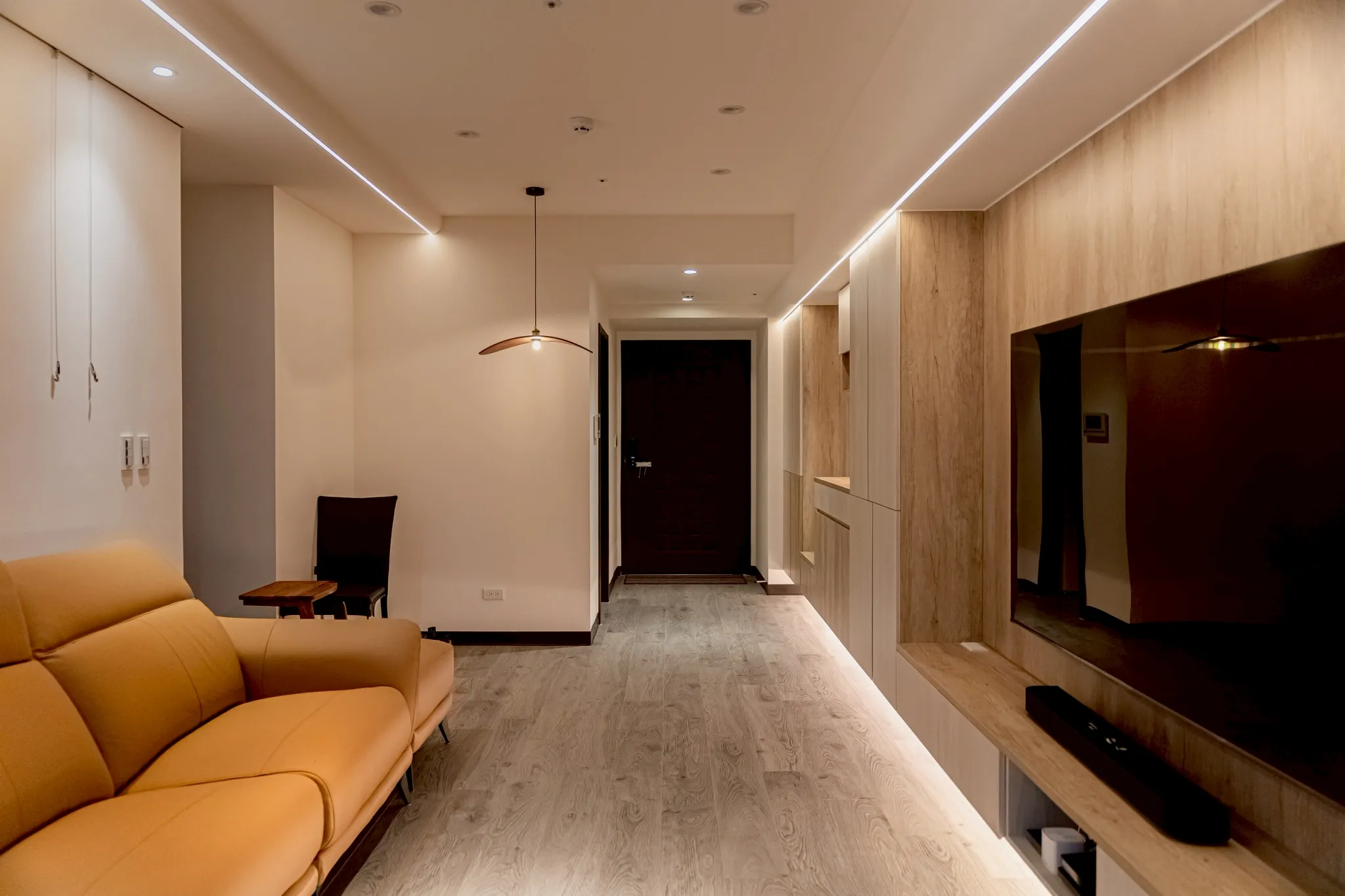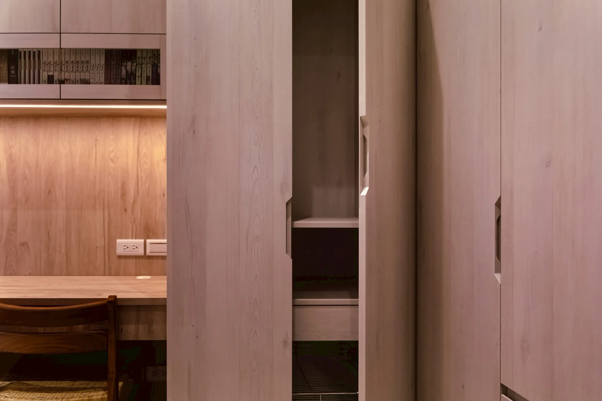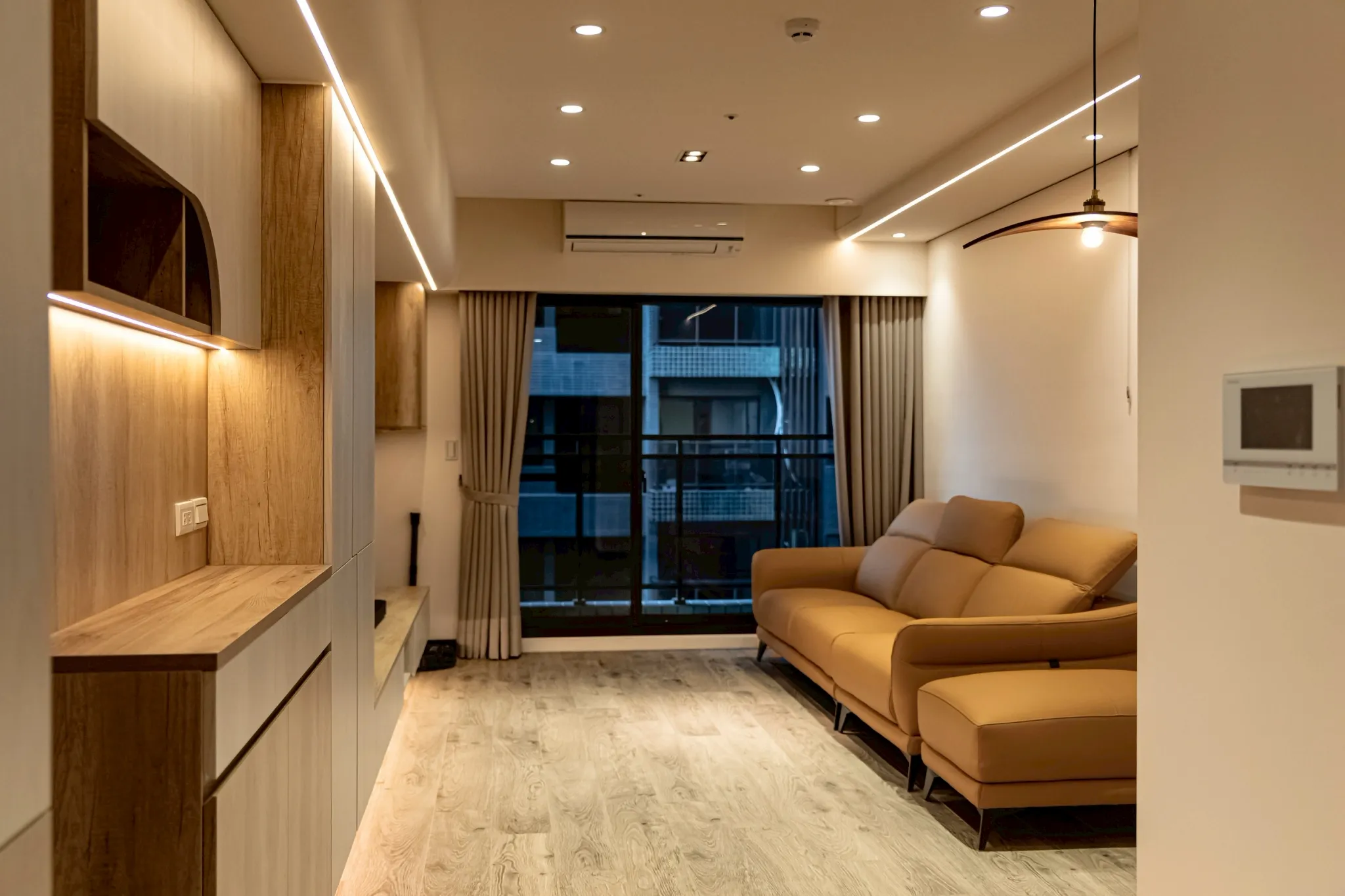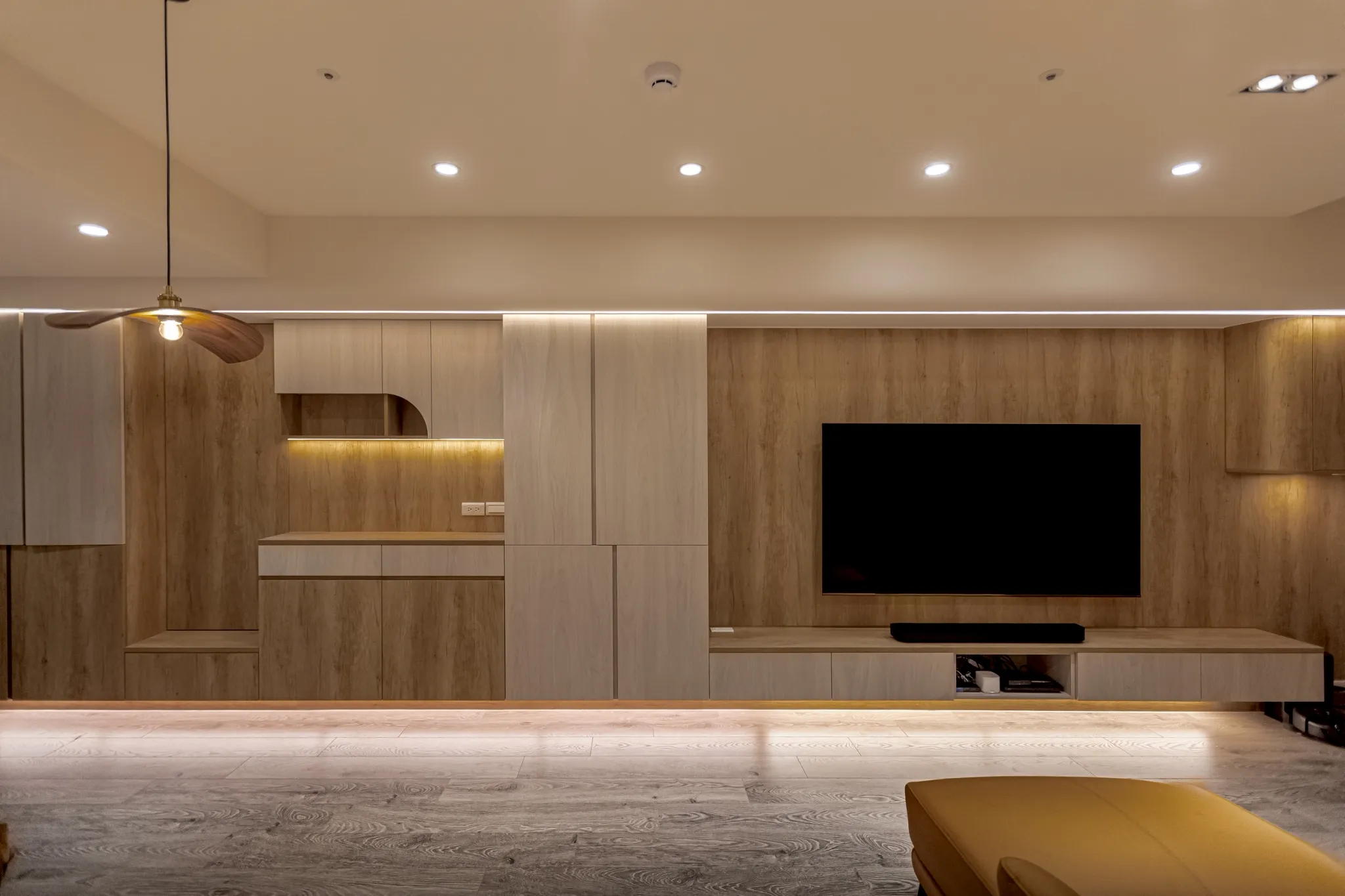 公共空間以開放式配置串聯客廳與主要生活機能,光線自然流動,讓日常互動在輕柔的氛圍中展開。木質立面與收納櫃體沿牆整合,兼顧實用性與視覺整潔,使空間在有限坪數中仍保有寬敞感。