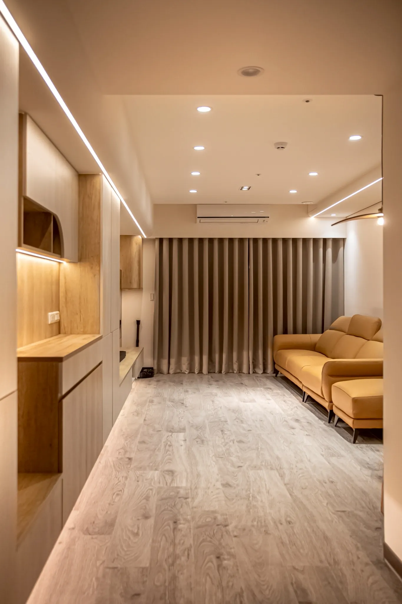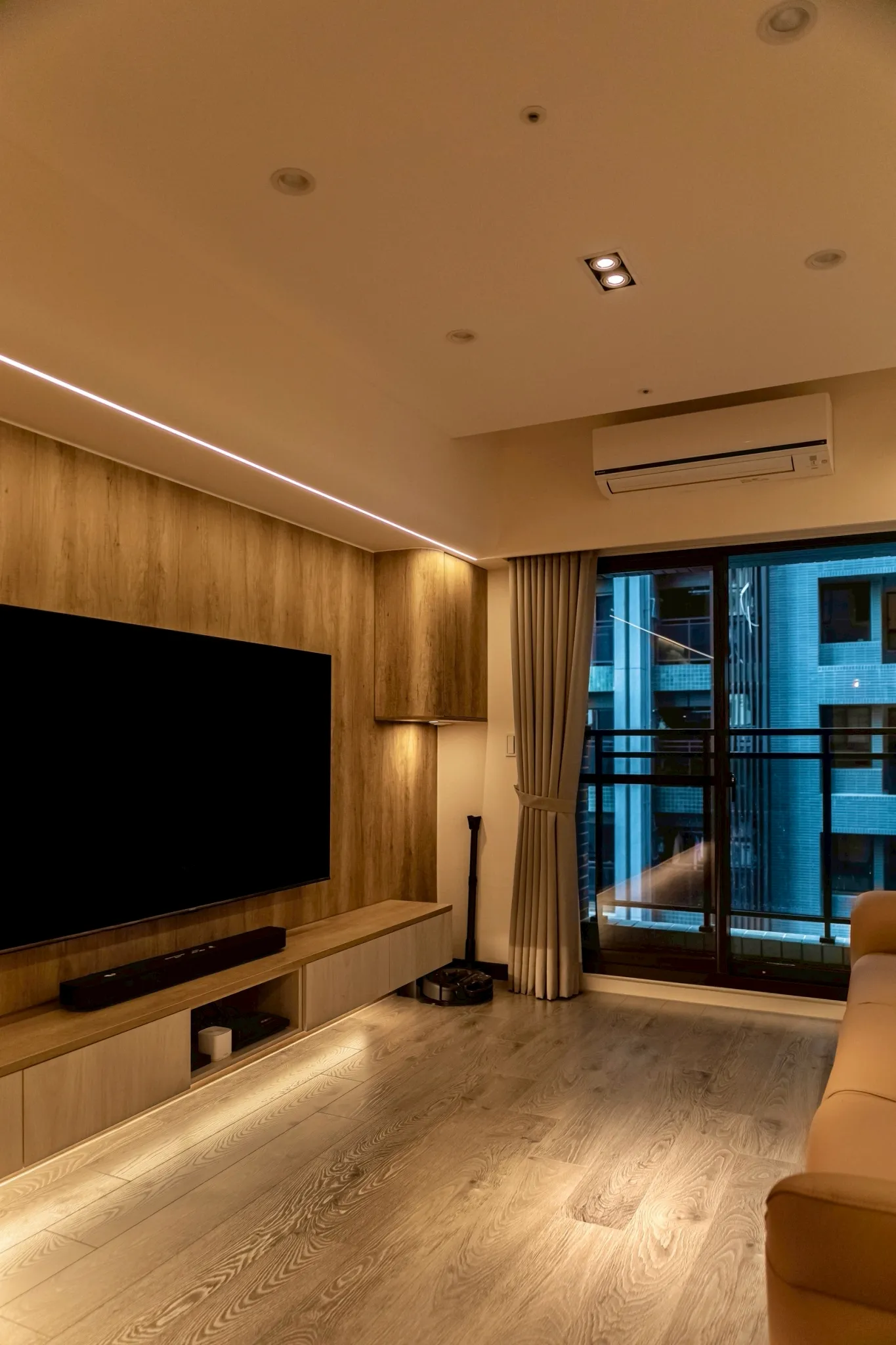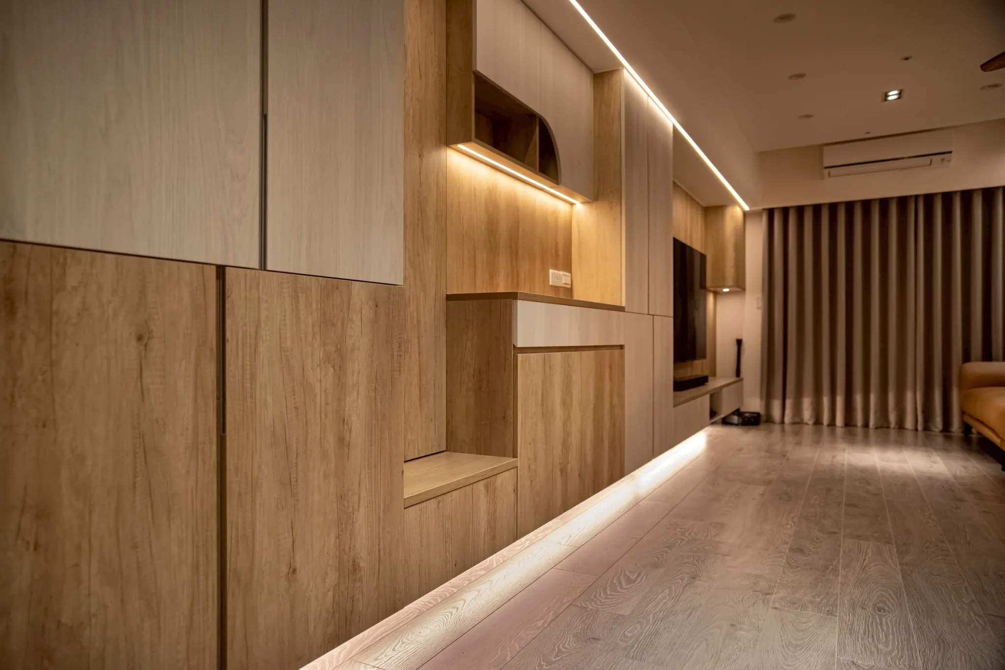 公共空間以開放式配置串聯客廳與主要生活機能,光線自然流動,讓日常互動在輕柔的氛圍中展開。木質立面與收納櫃體沿牆整合,兼顧實用性與視覺整潔,使空間在有限坪數中仍保有寬敞感。