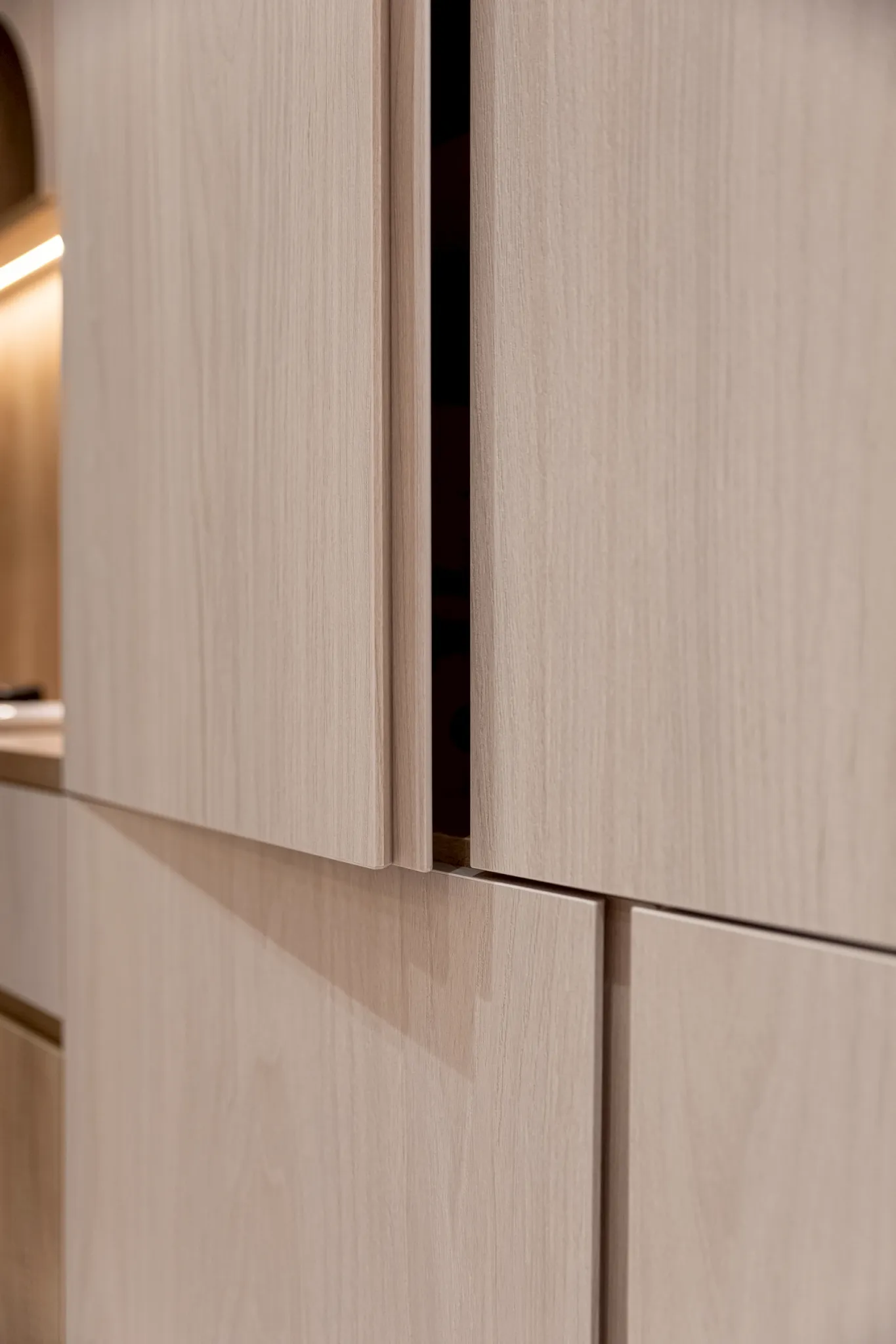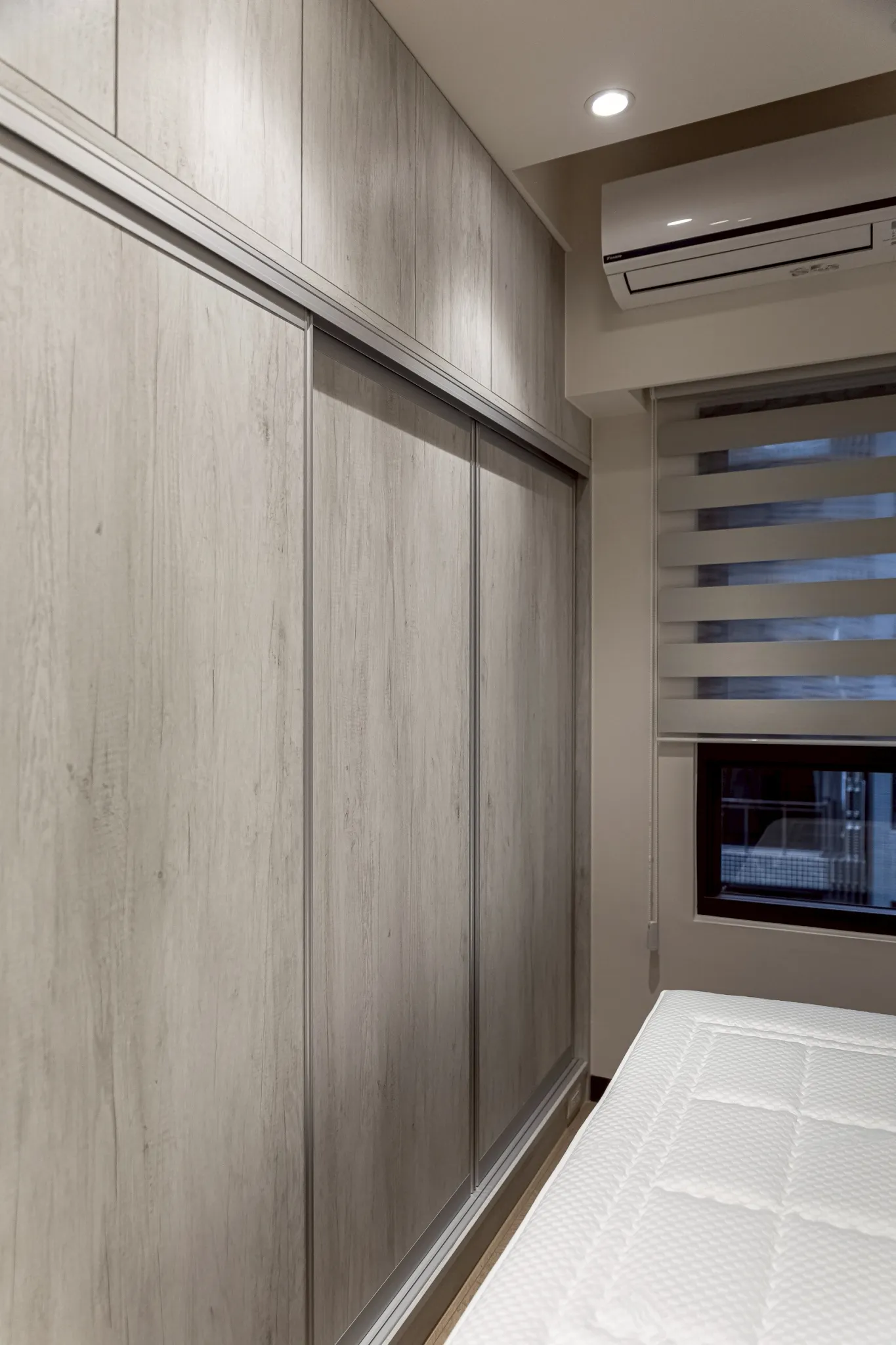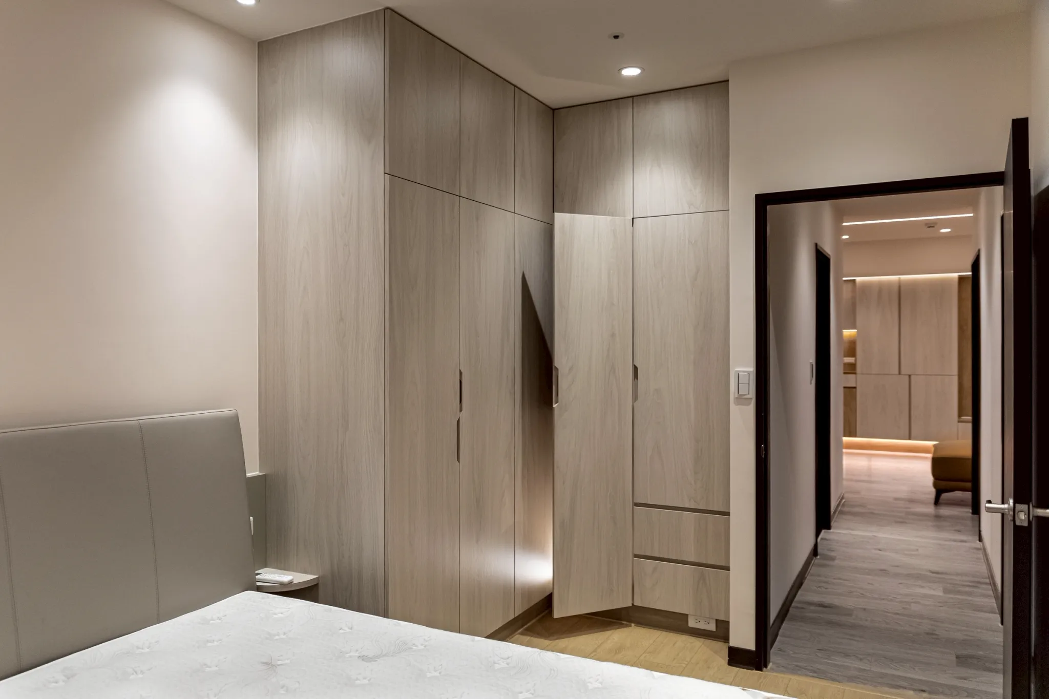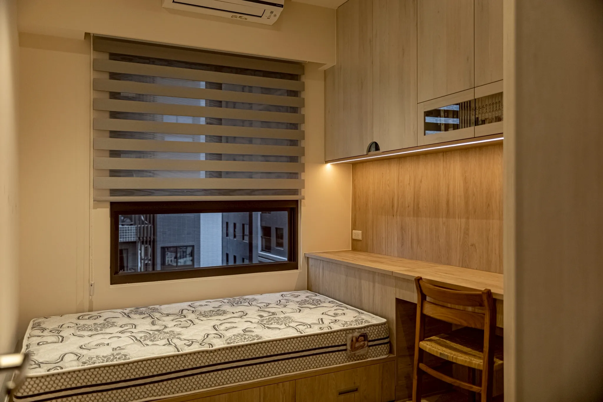 公共空間以開放式配置串聯客廳與主要生活機能,光線自然流動,讓日常互動在輕柔的氛圍中展開。木質立面與收納櫃體沿牆整合,兼顧實用性與視覺整潔,使空間在有限坪數中仍保有寬敞感。