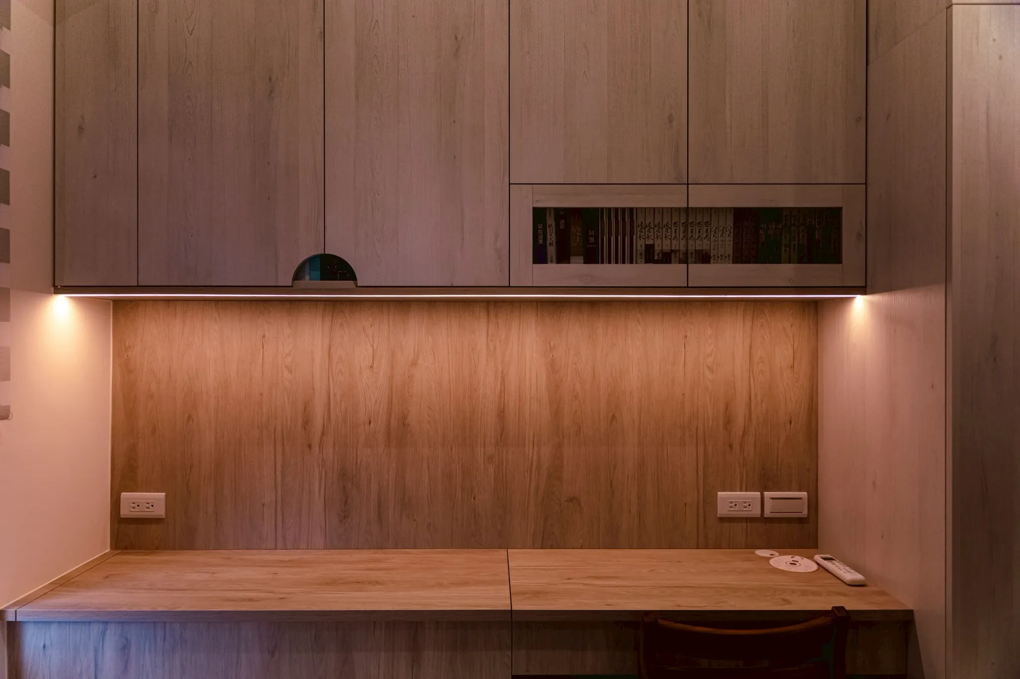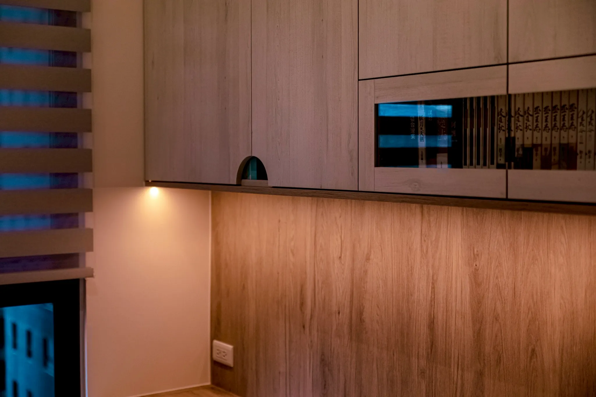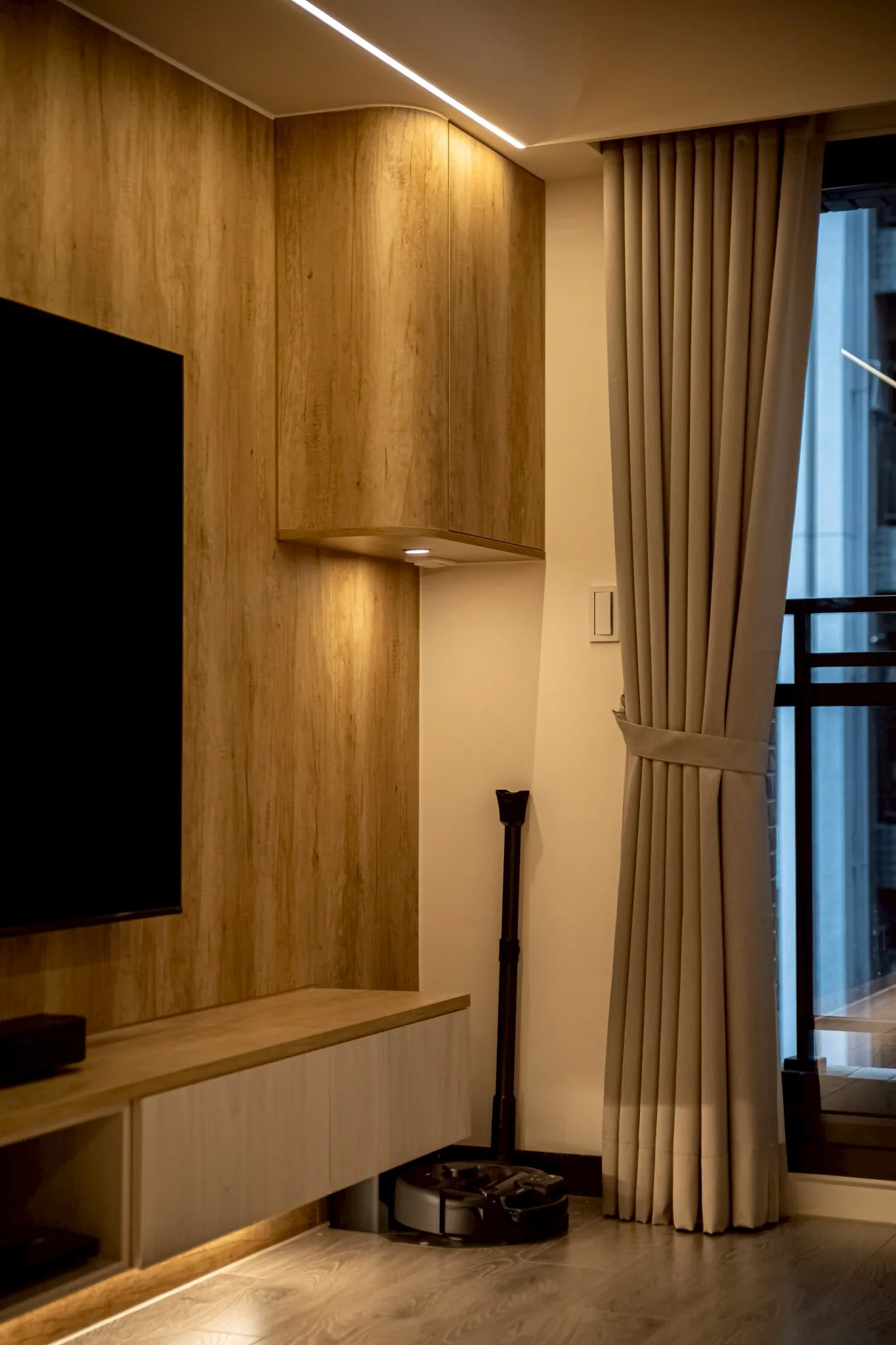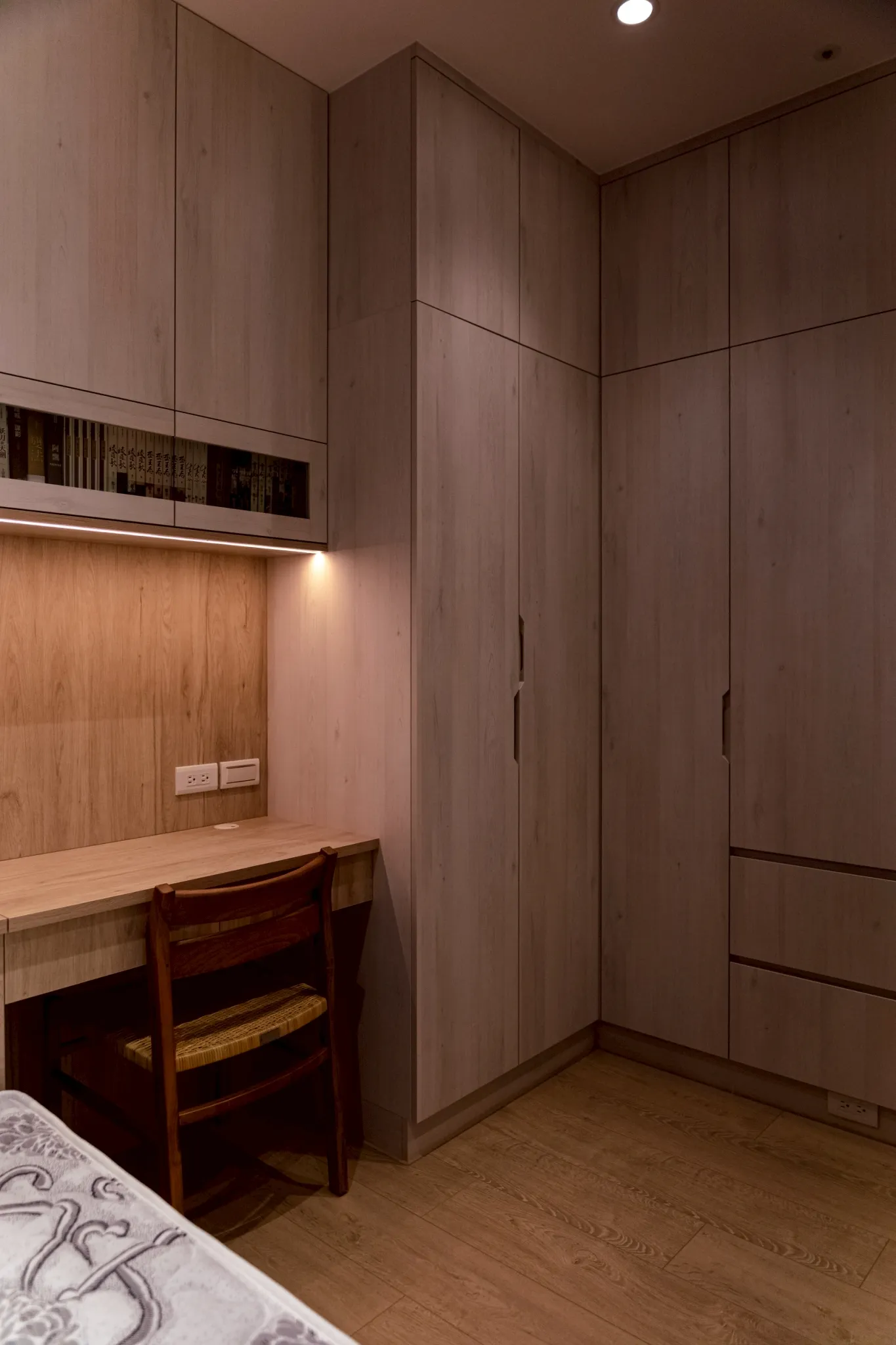 收納設計被低調地融入生活之中,生活用品各自安放,不刻意展示,讓空間保持安靜有序。燈光以間接照明為主,夜晚回到家時,柔和的光線慢慢鋪展,成為結束一天的溫暖片刻。